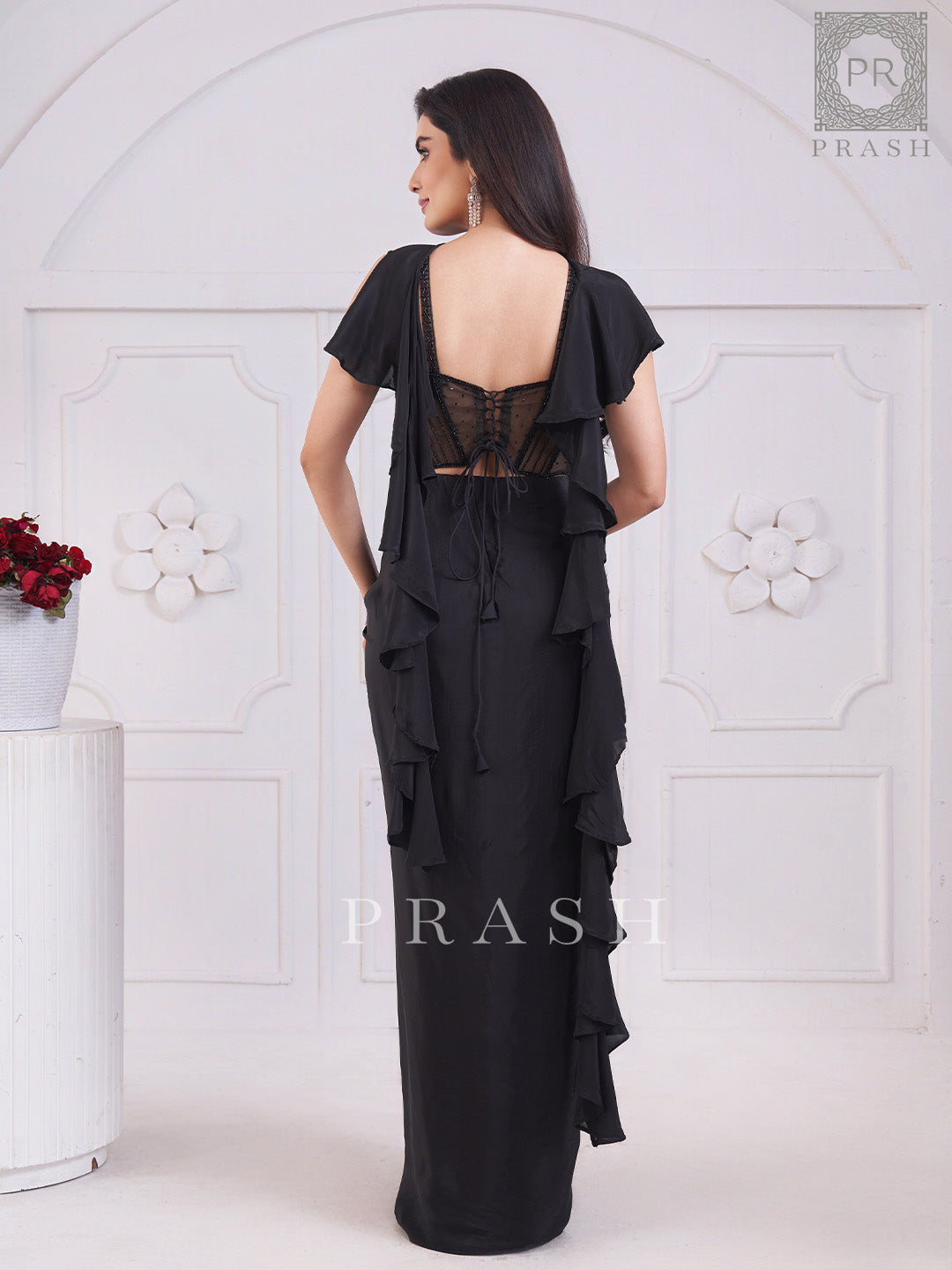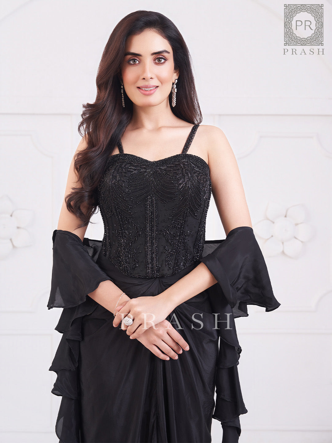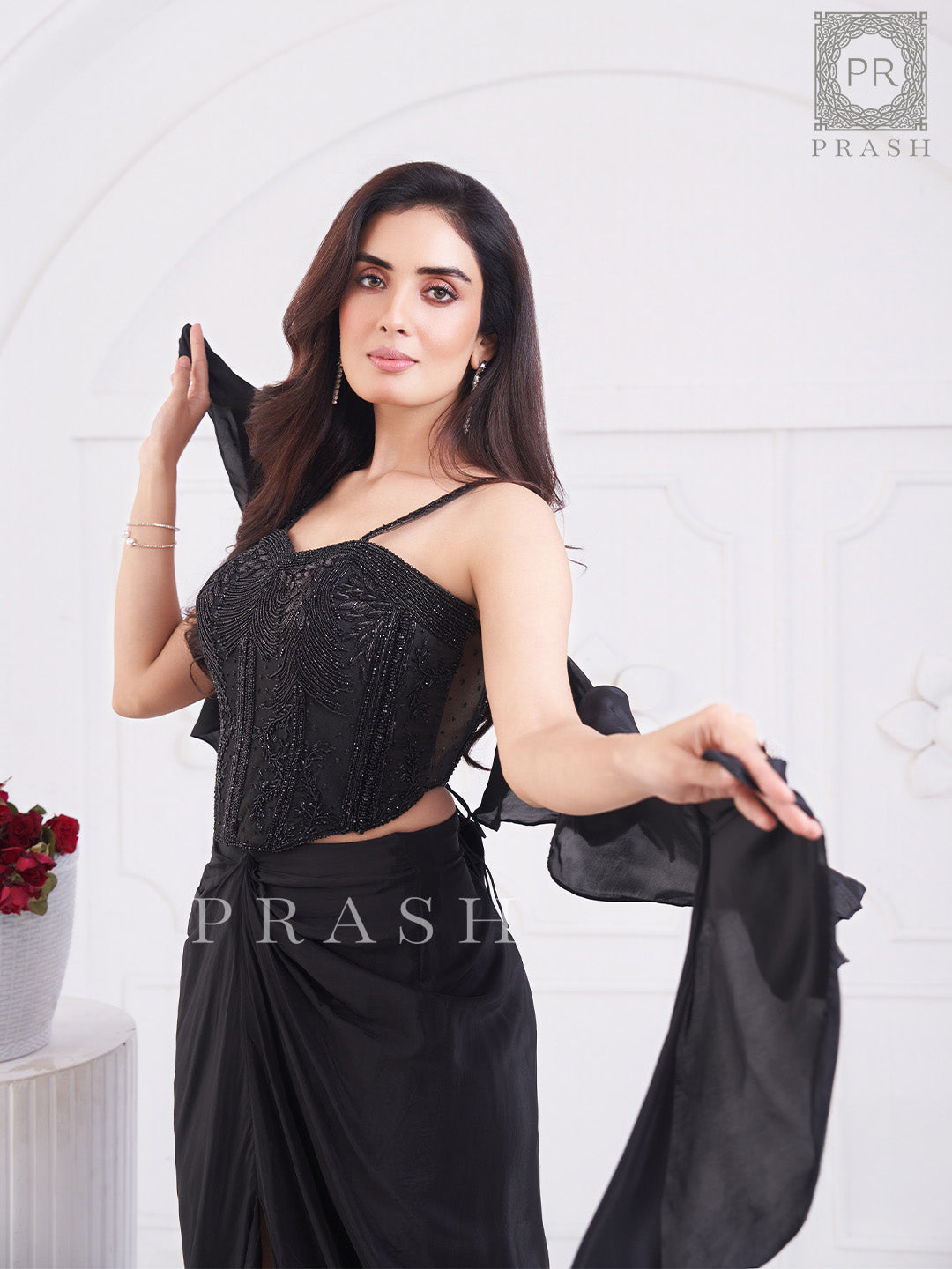 • Meet your new favorite evening look: the stunning Black Lycra Handwork Indo-Western outfit.