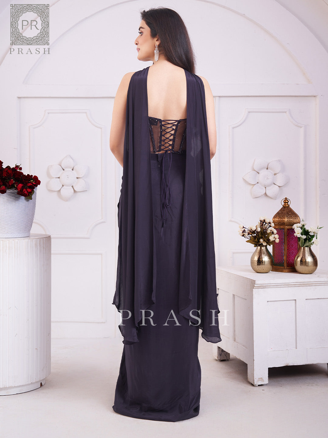 - Prepare to feel like royalty in this captivating Deep Purple Lycra Handwork Indo-Western piece.