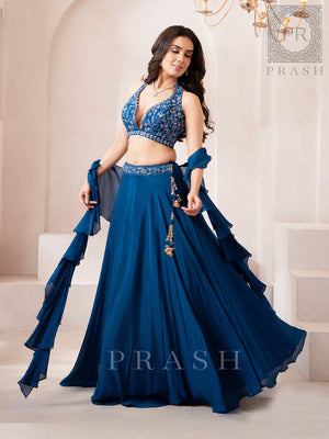 Elevate your ethnic wardrobe with this stunning Blue Chinon Lehenga Choli, perfect for weddings, festive occasions, and celebrations. Made from lightweight Chinon fabric, it drapes beautifully for a flowing, graceful silhouette. The vibrant blue hue adds a refreshing and elegant touch, making it a perfect choice for traditional and festive events.