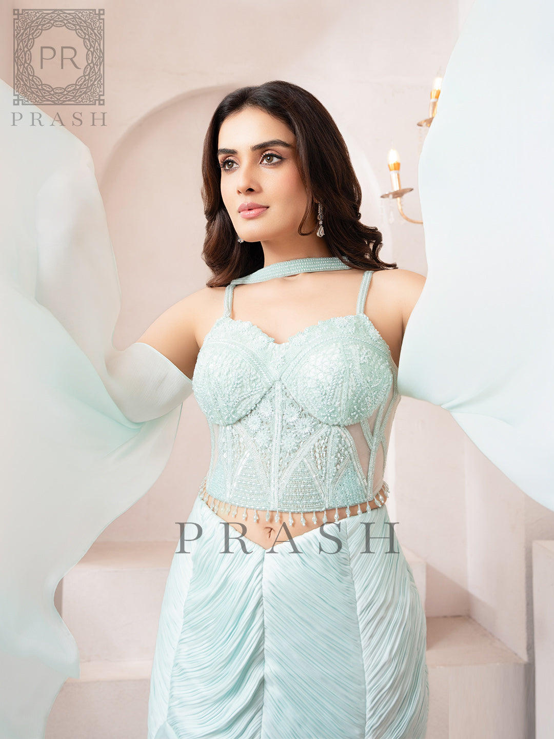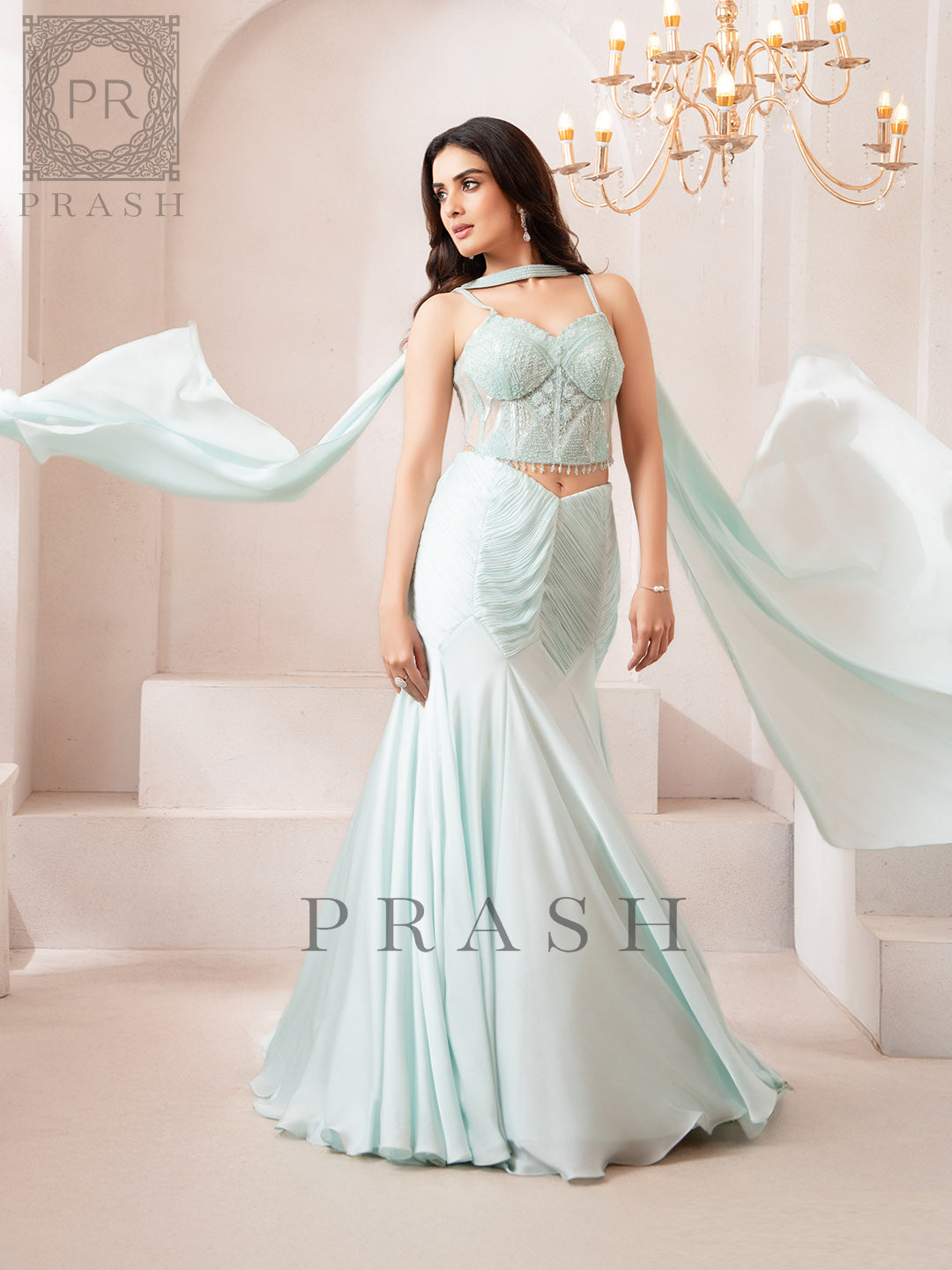 Step into graceful elegance with this Ice Blue Indo Western Fishcut Lehenga, crafted from premium imported crape fabric for a soft, flowing silhouette. The contemporary...