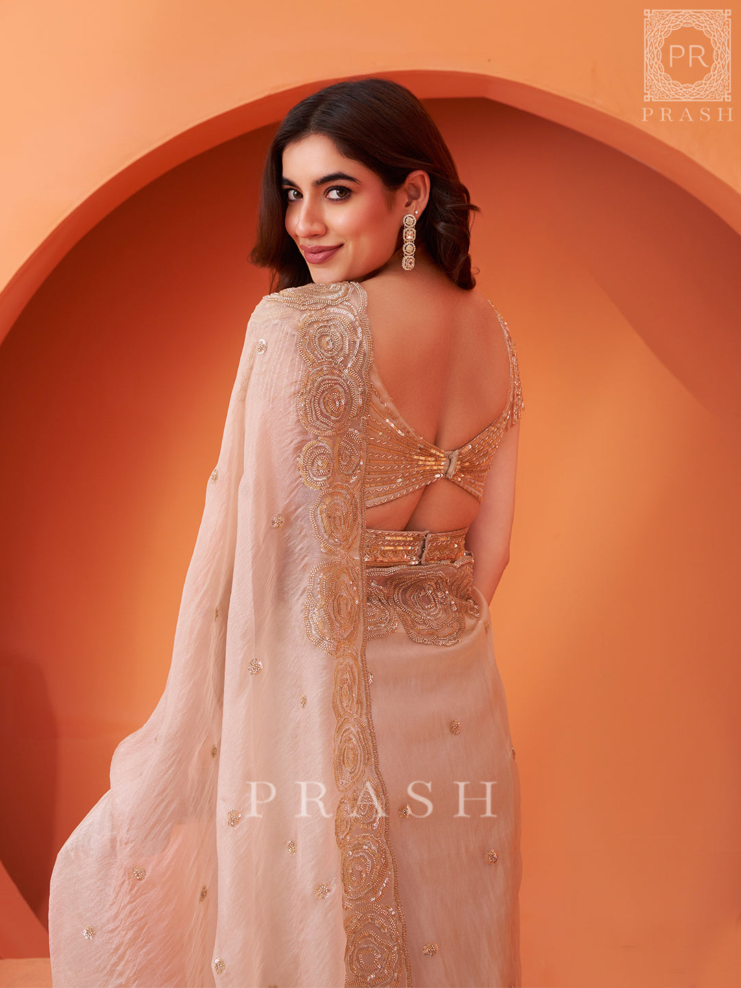 Celebrate in style with this rose gold designer Saree, crafted to bring out grace and modern sophistication. Featuring a beautifully embroidered bodice, pleated skirt, and flowing layers, this gown is perfect for festivals, weddings, receptions, and evening parties. Designed for comfort and glamour, it adds the right sparkle to your festive wardrobe.
